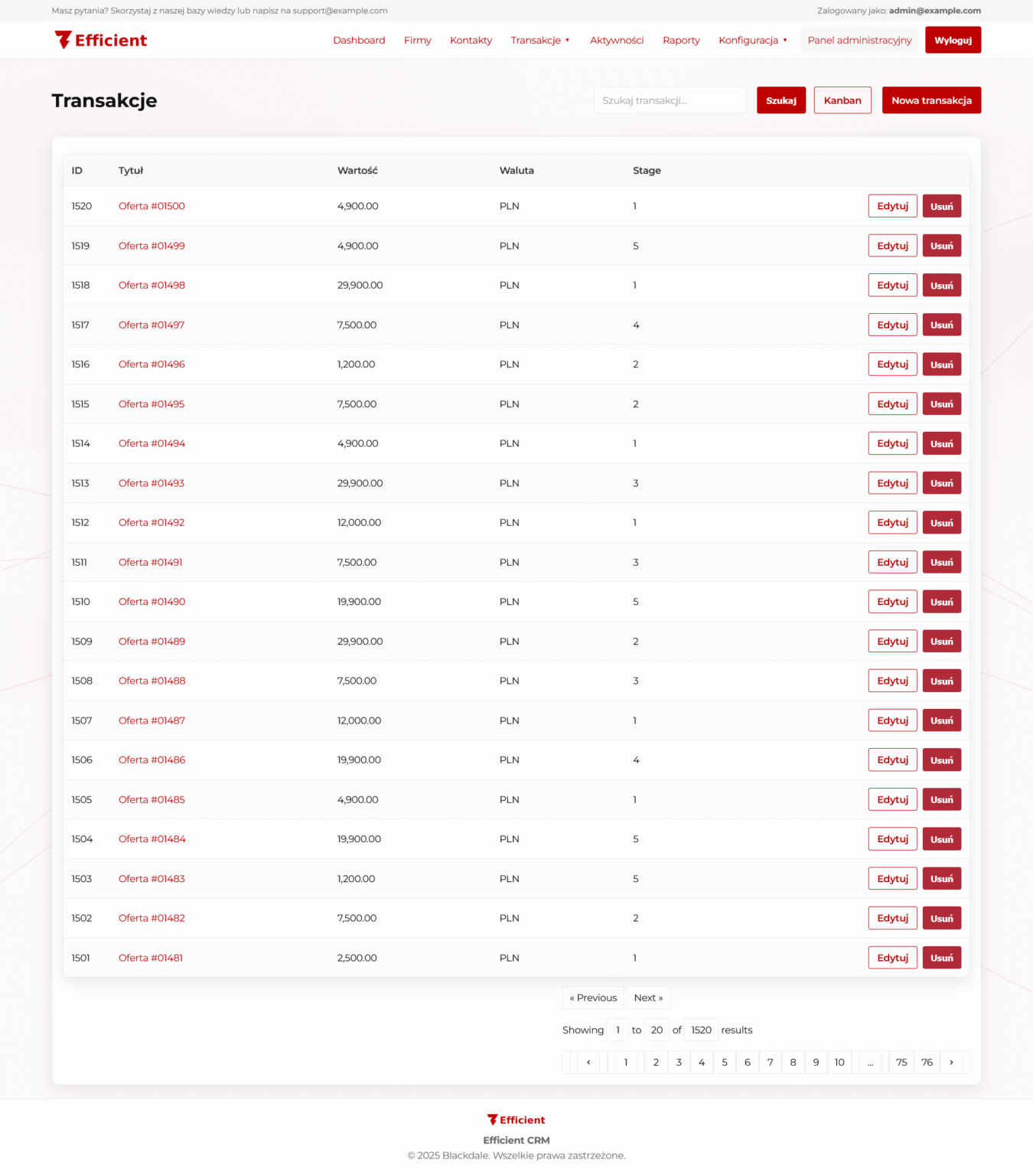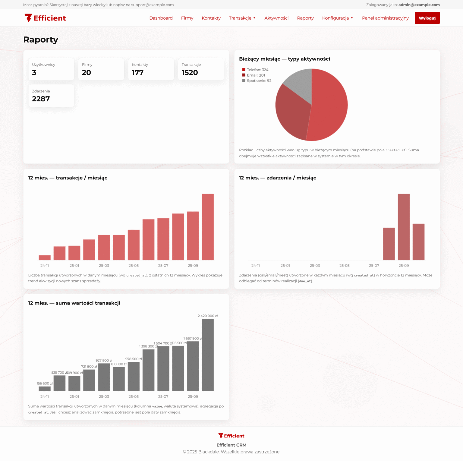 Dedykowany CRM zbudowany na Laravel (PHP 8.x) z lekkim frontem w vanilla JavaScript i czystym CSS — świadomie z minimalną liczbą zależności, co obniża koszty serwisu i upraszcza aktualizacje. System obejmuje kompletny pipeline sprzedaży, karty klienta 360° (historia kontaktów, dokumenty, powiązane szanse), moduł ofert i zamówień, zadania z SLA oraz czytelne raporty i dashboardy.